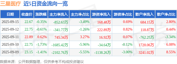 证券之星消息,截至2025年9月15日收盘,三星医疗(601567)报收于22.67元,下跌0.35%,换手率0.77%,成交量10.79万手,成交额2.45亿元。