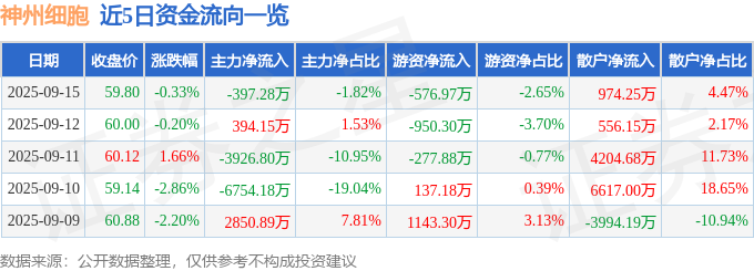 9月15日的资金流向数据方面,主力资金净流出397.28万元,占总成交额1.82%,游资资金净流出576.97万元,占总成交额2.65%,散户资金净流入974.25万元,占总成交额4.47%。