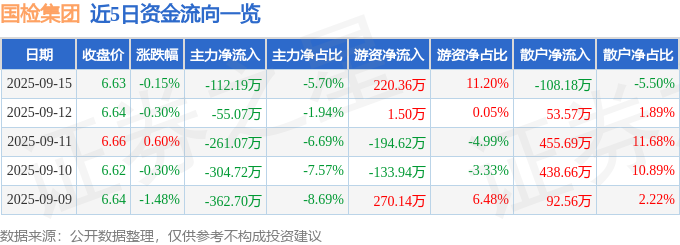 证券之星消息,截至2025年9月15日收盘,国检集团(603060)报收于6.63元,下跌0.15%,换手率0.37%,成交量2.97万手,成交额1966.75万元。