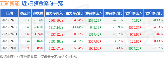 证券之星消息,截至2025年9月15日收盘,五矿新能(688779)报收于7.39元,下跌0.14%,换手率3.85%,成交量74.36万手,成交额5.6亿元。