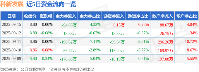 9月15日的资金流向数据方面,主力资金净流出94.83万元,占总成交额4.32%,游资资金净流入6.15万元,占总成交额0.28%,散户资金净流入88.67万元,占总成交额4.04%。