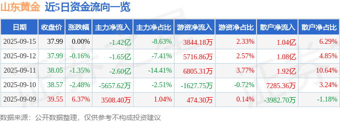 证券之星消息,截至2025年9月15日收盘,山东黄金(600547)报收于37.99元,上涨0.0%,换手率1.2%,成交量43.24万手,成交额16.47亿元。