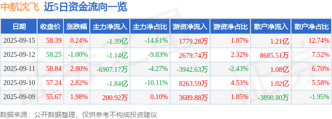 证券之星消息,截至2025年9月15日收盘,中航沈飞(600760)报收于58.39元,上涨0.24%,换手率0.59%,成交量16.29万手,成交额9.52亿元。