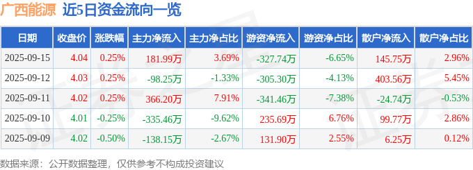 证券之星消息,截至2025年9月15日收盘,广西能源(600310)报收于4.04元,上涨0.25%,换手率0.83%,成交量12.23万手,成交额4927.16万元。