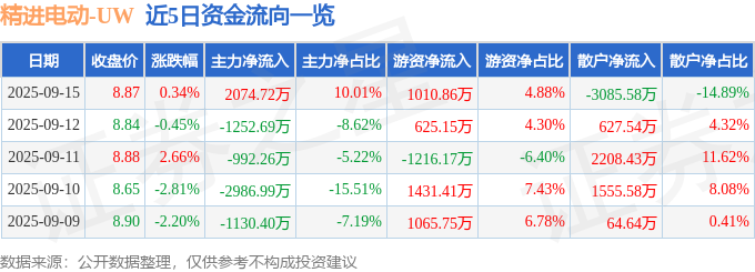 证券之星消息,截至2025年9月15日收盘,精进电动(688280)报收于8.87元,上涨0.34%,换手率4.42%,成交量23.02万手,成交额2.07亿元。