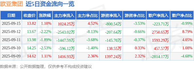 9月15日的资金流向数据方面,主力资金净流入1024.25万元,占总成交额4.52%,游资资金净流出800.54万元,占总成交额3.53%,散户资金净流出223.71万元,占总成交额0.99%。