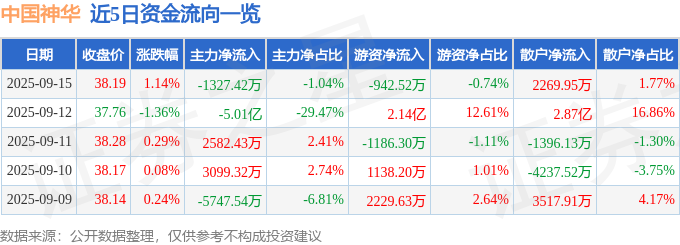 证券之星消息,截至2025年9月15日收盘,中国神华(601088)报收于38.19元,上涨1.14%,换手率0.2%,成交量33.7万手,成交额12.82亿元。