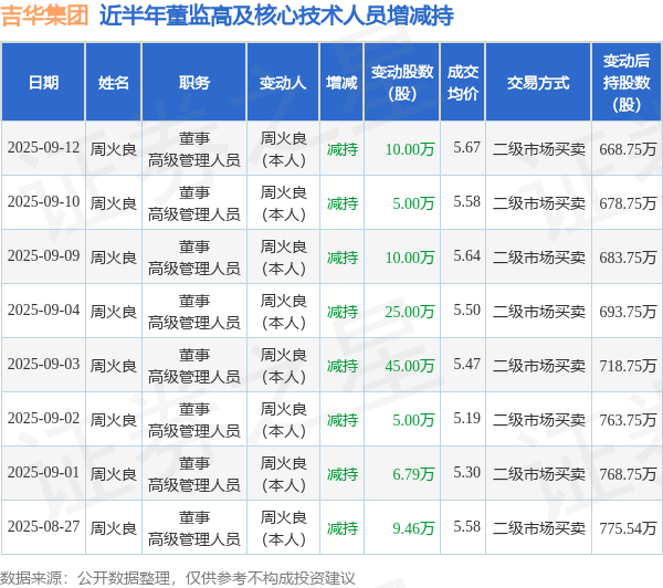 吉华集团近半年内的董监高及核心技术人员增减持详情如下: