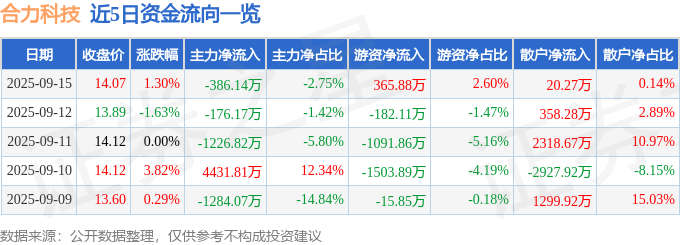 9月15日的资金流向数据方面,主力资金净流出386.14万元,占总成交额2.75%,游资资金净流入365.88万元,占总成交额2.6%,散户资金净流入20.27万元,占总成交额0.14%。