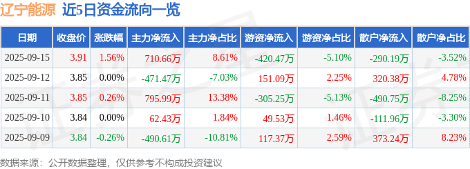 证券之星消息,截至2025年9月15日收盘,辽宁能源(600758)报收于3.91元,上涨1.56%,换手率1.62%,成交量21.38万手,成交额8252.39万元。