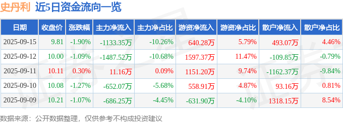 证券之星消息,截至2025年9月15日收盘,史丹利(002588)报收于9.81元,下跌1.9%,换手率1.31%,成交量11.22万手,成交额1.1亿元。