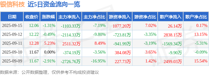 证券之星消息,截至2025年9月15日收盘,银信科技(300231)报收于12.06元,下跌1.31%,换手率2.87%,成交量12.76万手,成交额1.54亿元。