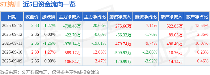 证券之星消息,截至2025年9月15日收盘,ST纳川(300198)报收于2.33元,下跌1.27%,换手率1.61%,成交量16.54万手,成交额3861.5万元。