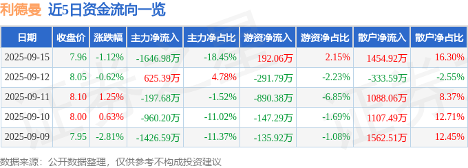 证券之星消息,截至2025年9月15日收盘,利德曼(300289)报收于7.96元,下跌1.12%,换手率2.06%,成交量11.2万手,成交额8926.74万元。