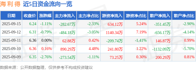证券之星消息,截至2025年9月15日收盘,海 利 得(002206)报收于6.24元,下跌1.11%,换手率2.24%,成交量19.35万手,成交额1.21亿元。