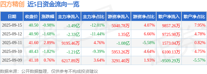 证券之星消息,截至2025年9月15日收盘,四方精创(300468)报收于40.5元,下跌0.98%,换手率5.72%,成交量30.3万手,成交额12.4亿元。