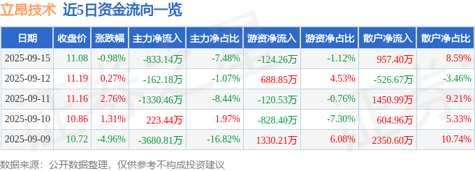 证券之星消息,截至2025年9月15日收盘,立昂技术(300603)报收于11.08元,下跌0.98%,换手率2.72%,成交量10.04万手,成交额1.11亿元。