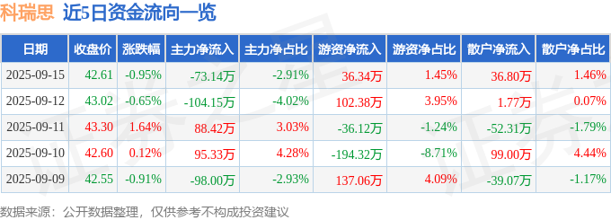 证券之星消息,截至2025年9月15日收盘,科瑞思(301314)报收于42.61元,下跌0.95%,换手率3.62%,成交量5876.0手,成交额2512.69万元。