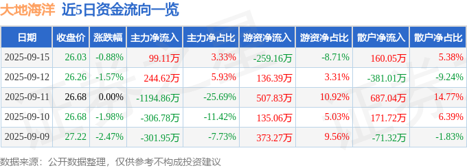证券之星消息,截至2025年9月15日收盘,大地海洋(301068)报收于26.03元,下跌0.88%,换手率1.14%,成交量1.15万手,成交额2976.22万元。
