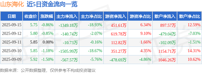 证券之星消息,截至2025年9月15日收盘,山东海化(000822)报收于5.75元,下跌0.86%,换手率1.39%,成交量12.41万手,成交额7128.43万元。