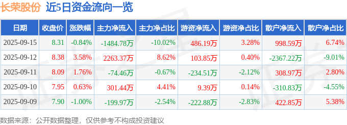 证券之星消息,截至2025年9月15日收盘,长荣股份(300195)报收于8.31元,下跌0.84%,换手率5.68%,成交量17.83万手,成交额1.48亿元。