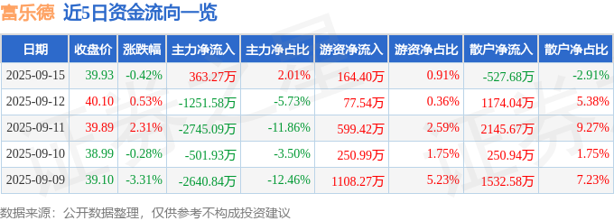 证券之星消息,截至2025年9月15日收盘,富乐德(301297)报收于39.93元,下跌0.42%,换手率3.19%,成交量4.5万手,成交额1.81亿元。