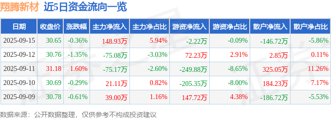 证券之星消息,截至2025年9月15日收盘,翔腾新材(001373)报收于30.65元,下跌0.36%,换手率2.46%,成交量8162.0手,成交额2505.64万元。