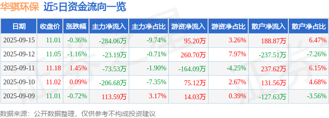 证券之星消息,截至2025年9月15日收盘,华骐环保(300929)报收于11.01元,下跌0.36%,换手率2.1%,成交量2.66万手,成交额2916.98万元。