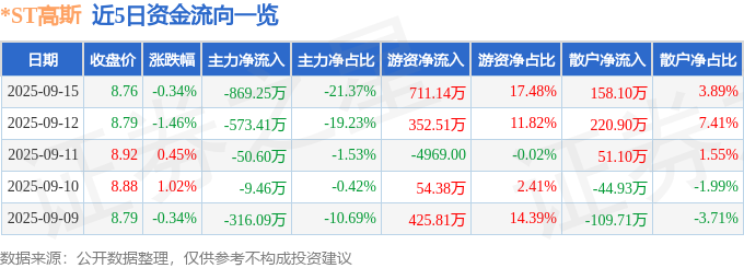 证券之星消息,截至2025年9月15日收盘,*ST高斯(002848)报收于8.76元,下跌0.34%,换手率2.8%,成交量4.61万手,成交额4067.38万元。