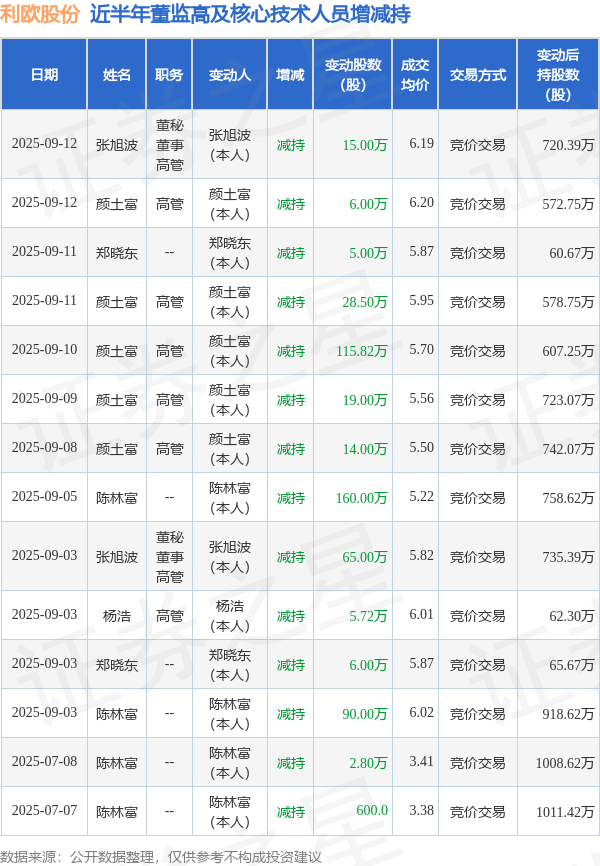利欧股份近半年内的董监高及核心技术人员增减持详情如下: