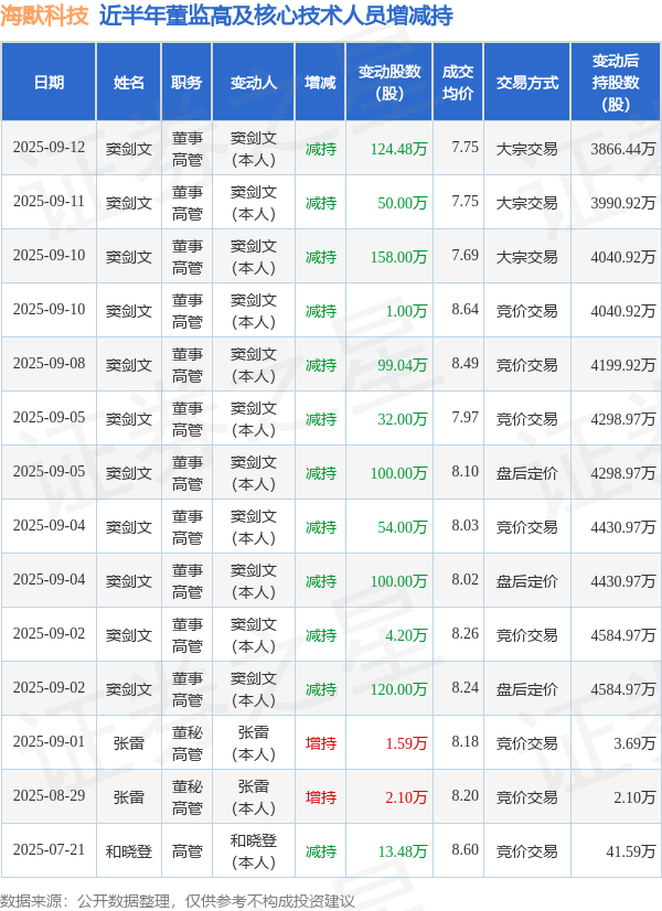 海默科技近半年内的董监高及核心技术人员增减持详情如下: