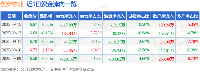 证券之星消息,截至2025年9月15日收盘,永安林业(000663)报收于6.67元,下跌0.3%,换手率1.19%,成交量3.64万手,成交额2417.23万元。