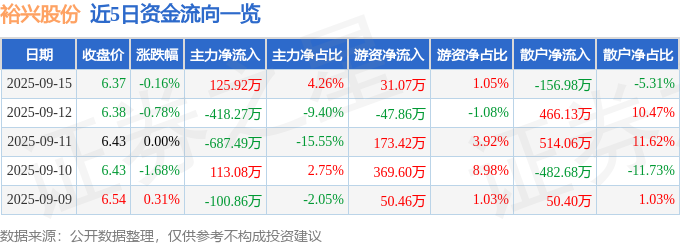 证券之星消息,截至2025年9月15日收盘,裕兴股份(300305)报收于6.37元,下跌0.16%,换手率1.45%,成交量4.66万手,成交额2954.21万元。