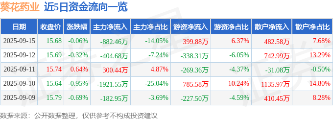 证券之星消息,截至2025年9月15日收盘,葵花药业(002737)报收于15.68元,下跌0.06%,换手率0.69%,成交量4.01万手,成交额6280.7万元。
