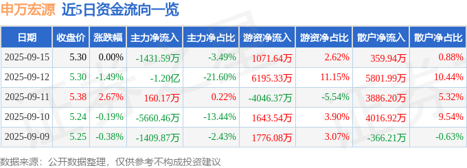 证券之星消息,截至2025年9月15日收盘,申万宏源(000166)报收于5.3元,上涨0.0%,换手率0.34%,成交量77.22万手,成交额4.1亿元。