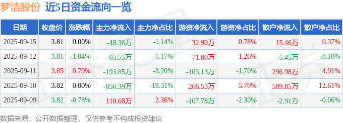 9月15日的资金流向数据方面,主力资金净流出48.36万元,占总成交额1.14%,游资资金净流入32.9万元,占总成交额0.78%,散户资金净流入15.46万元,占总成交额0.37%。