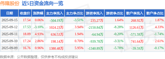 证券之星消息,截至2025年9月15日收盘,伟隆股份(002871)报收于17.54元,上涨0.06%,换手率5.34%,成交量8.18万手,成交额1.44亿元。