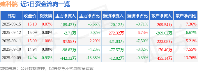 证券之星消息,截至2025年9月15日收盘,建科院(300675)报收于15.1元,上涨0.07%,换手率1.29%,成交量1.9万手,成交额2845.98万元。