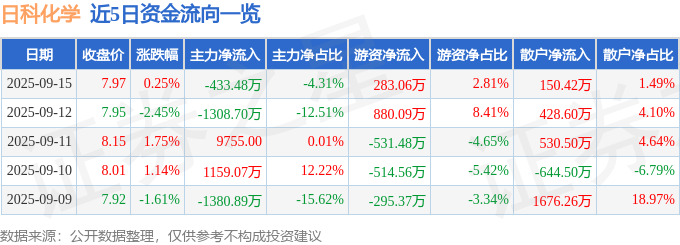 证券之星消息,截至2025年9月15日收盘,日科化学(300214)报收于7.97元,上涨0.25%,换手率3.15%,成交量12.69万手,成交额1.01亿元。