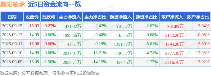 证券之星消息,截至2025年9月15日收盘,襄阳轴承(000678)报收于15.03元,上涨0.27%,换手率2.81%,成交量12.92万手,成交额1.95亿元。