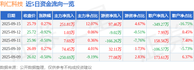 证券之星消息,截至2025年9月15日收盘,利仁科技(001259)报收于25.79元,上涨0.27%,换手率1.71%,成交量8110.0手,成交额2085.77万元。
