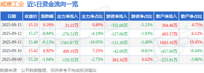 证券之星消息,截至2025年9月15日收盘,威唐工业(300707)报收于15.33元,上涨0.39%,换手率2.9%,成交量4.15万手,成交额6412.56万元。