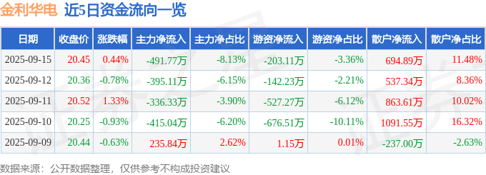 9月15日的资金流向数据方面,主力资金净流出491.77万元,占总成交额8.13%,游资资金净流出203.11万元,占总成交额3.36%,散户资金净流入694.89万元,占总成交额11.48%。