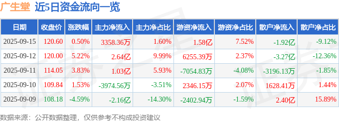证券之星消息,截至2025年9月15日收盘,广生堂(300436)报收于120.6元,上涨0.5%,换手率12.61%,成交量17.24万手,成交额21.02亿元。