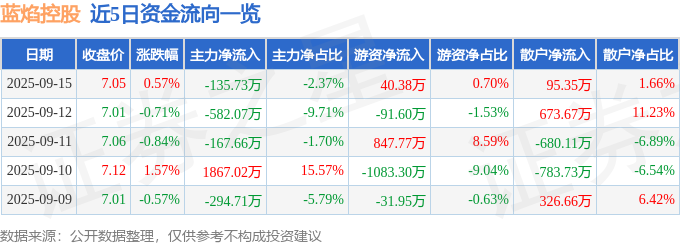 证券之星消息,截至2025年9月15日收盘,蓝焰控股(000968)报收于7.05元,上涨0.57%,换手率0.84%,成交量8.15万手,成交额5729.76万元。
