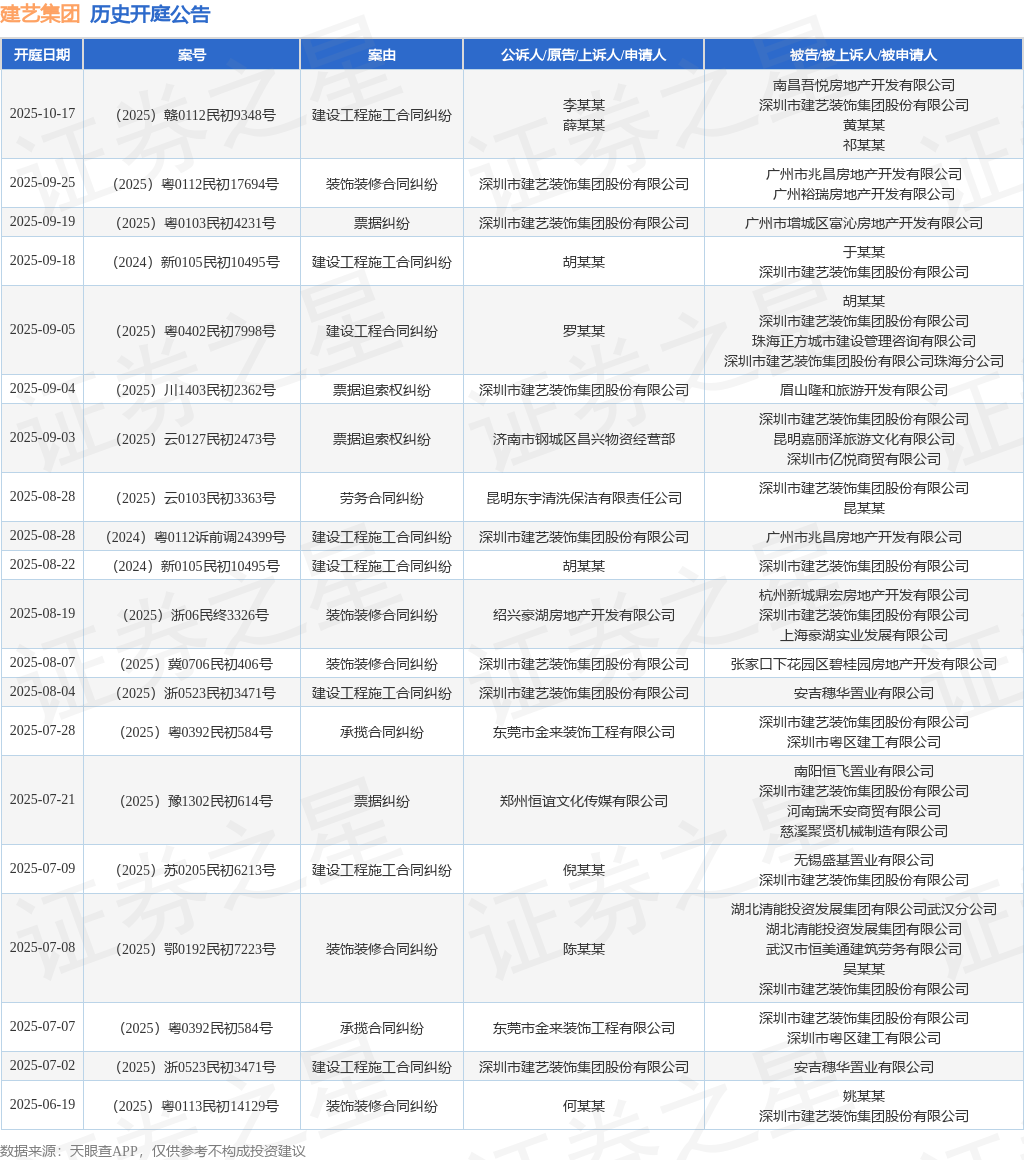案号:(2024)新0105民初10495号根据统计,近一年内以深圳市建艺装饰集团股份有限公司为当事人的历史开庭公告有185则,其中案由为“票据纠纷”的公告以43则居首,其次为“装饰装修合同纠纷”有34则,“建设工程施工合同纠纷”有29则。历史开庭公告(前20条)如下: