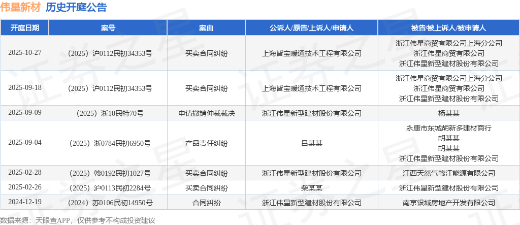案号:(2025)沪0112民初34353号根据统计,近一年内以浙江伟星新型建材股份有限公司为当事人的历史开庭公告有7则,其中案由为“买卖合同纠纷”的公告以4则居首,其次为“产品责任纠纷”有1则,“合同纠纷”有1则。历史开庭公告如下:
