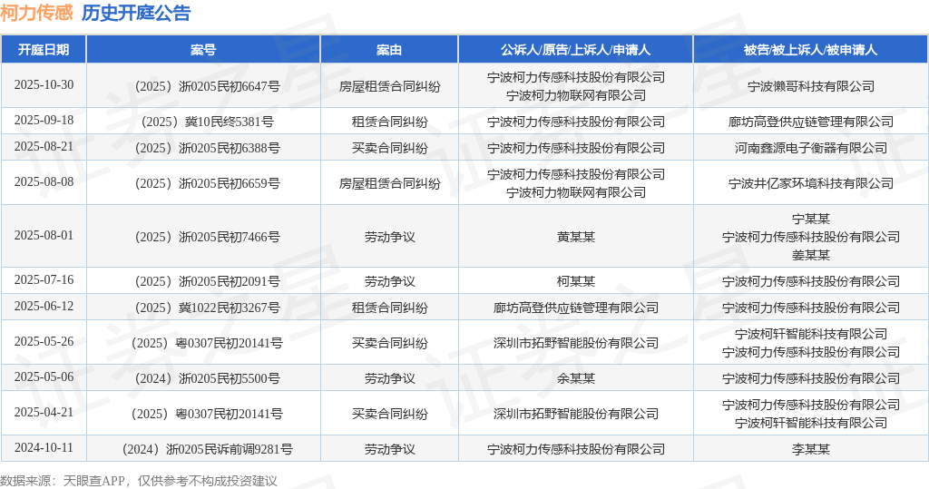 案号:(2025)冀10民终5381号根据统计,近一年内以宁波柯力传感科技股份有限公司为当事人的历史开庭公告有11则,其中案由为“劳动争议”的公告以4则居首,其次为“买卖合同纠纷”有3则,“房屋租赁合同纠纷”有2则。历史开庭公告如下:
