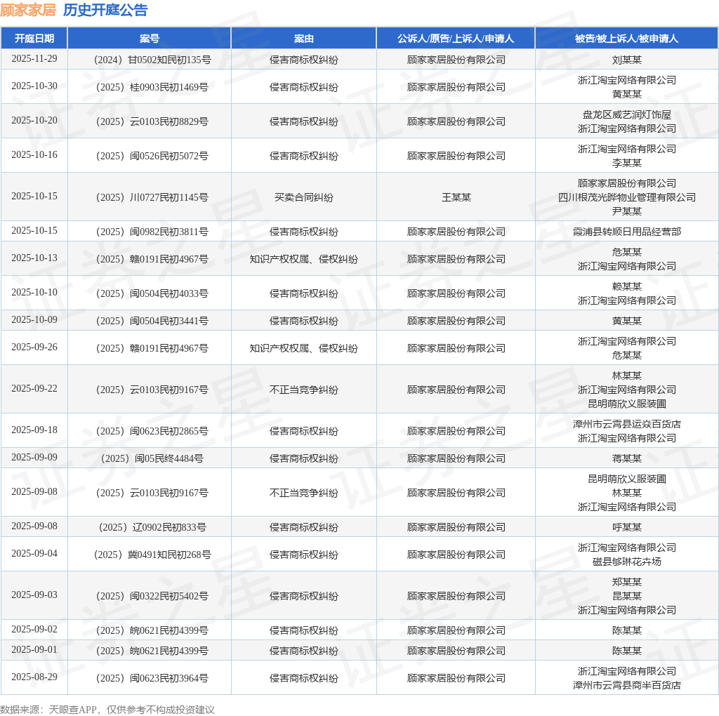 案号:(2025)闽0623民初2865号根据统计,近一年内以顾家家居股份有限公司为当事人的历史开庭公告有189则,其中案由为“侵害商标权纠纷”的公告以149则居首,其次为“买卖合同纠纷”有7则,“商标权权属、侵权纠纷”有7则。历史开庭公告(前20条)如下:
