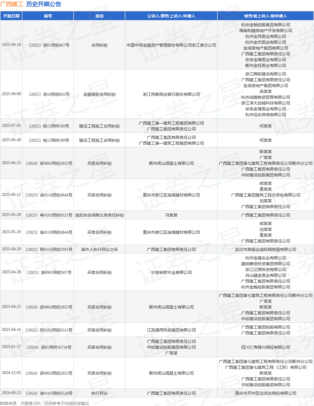 案号:(2025)浙01民初407号根据统计,近一年内以广西建工集团有限责任公司为当事人的历史开庭公告有15则,其中案由为“买卖合同纠纷”的公告以8则居首,其次为“建设工程施工合同纠纷”有2则,“合同纠纷”有1则。历史开庭公告如下: